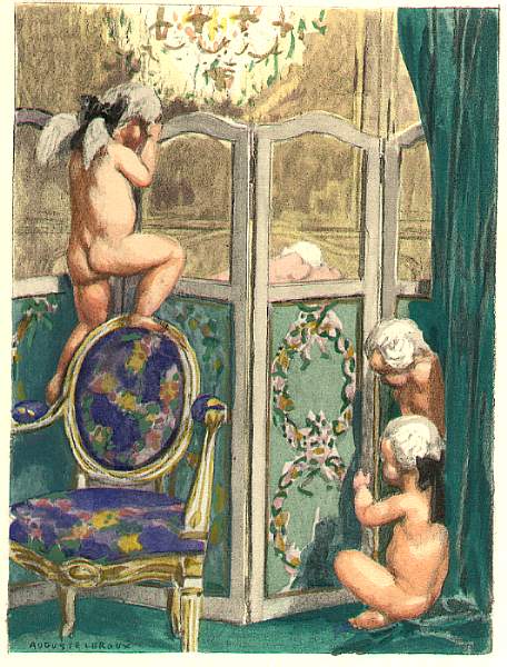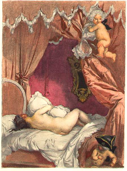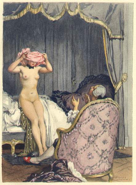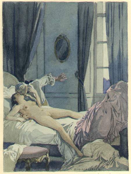 [Here Leroux illustrates a passage in the Bourdeaux edition that differs considerably from the uncorrupted text editions. Leroux pictures Madame Baret, who, in the absence of her husband, dresses herself in front of Casanova’s eyes for supper. This scene doesn’t occur in the later, oncorrupted editions.
