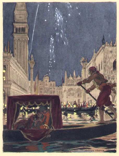 [This illustration doesn’t refer to any particular situation in the last part of Casanova’s autobiography. Once more Leroux refers to Venice, the carnival, and the gondola.]
